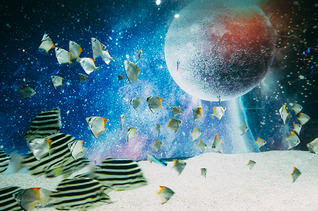 アクアリウム宇宙旅行「UNDER WATER SPACE」は、既存の商業施設に建設が可能な新しいスタイルの水族館で、映像システムや音響、光、プロジェクションマッピングなどの最新のテクノロジーを取り入れ、空間を楽しむ8つの演出(光・影・水・音・香・動・生・驚)を提供する約220坪のエンターテイメント空間です。