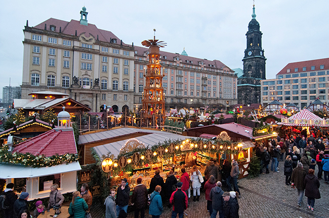 「世界最古」といわれるドレスデンのクリスマスマーケット。世界最大級の14メートルのクリスマスピラミッドは圧巻。クリスマスツリーより古い歴史を持つこのピラミッドは、くるみ割り人形で有名なザクセン州ザイフェン村で製作。「東京クリスマスマーケット」の大型ピラミッドも、くるみ割り人形の職人たちによって製作され2015年にはじめて登場しました。
