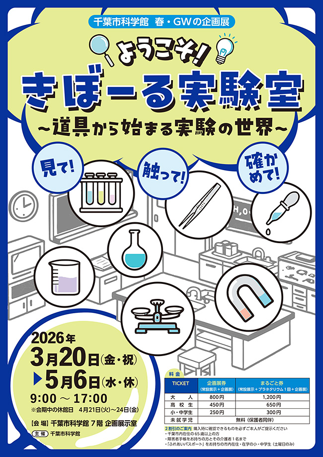 千葉市科学館では、3月20日(金・祝)より春・GWの企画展 『ようこそ!きぼーる実験室~道具から始まる実験の世界~』 を開催します。